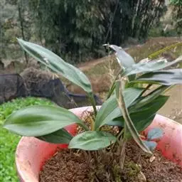 方法一 准备好兰盆及植料后,将兰株倒拿(根在上,叶在下)放于水龙头下以慢水冲洗,但水压切忌过强,以免伤兰根及叶子。用拇指和食指抓住兰头,小指抵住盆缘,用竹筷将根固定,当放入盆内时,尽量不要让根接触到盆壁。将豆粒大的混合石砾倒入盆底至三分之一处。然后倒入中粒植料至五分之四处,填实和尽量不要留下空间。将竹筷拔出,并摇实盆中植料。填实植料后,再用大粒植料埴入至距盆缘1.5厘米处。最后再倒入豆粒大植料,以将假鳞茎全部埋入土中为度,然后充分摇实。用压土工具轻压植料,并将表面弄平。种植完毕后,植料在盆中以中央稍高为好。