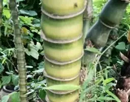 竿黄色,竿稍疏离,高8-15米,直径5-9厘米,尾梢下弯,下部挺直或略呈“之”字形曲折;节间正常,但具宽窄不等的绿色纵条纹,长20-30厘米,幼时稍被白蜡粉,并贴生以淡棕色刺毛,老则无粉无毛,竿壁稍厚;节处稍隆起,竿基数节具短气根,并于箨环之上下方各环生一圈灰白色绢毛;分枝常自竿下部节开始,每节数枝至多枝簇生,主枝较粗长。