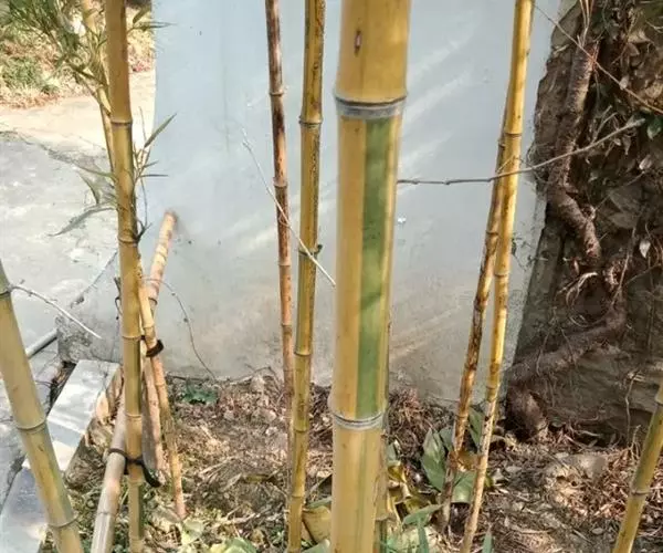 黄金间碧竹,其杆及主枝呈黄色,其节间于分枝一侧之沟槽中常呈鲜绿色,有时其旁侧亦有同样绿色条纹2-3条,故名黄金间碧竹。