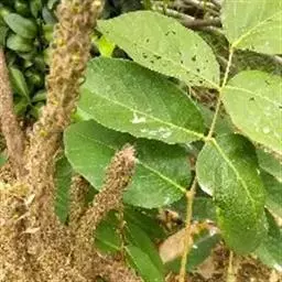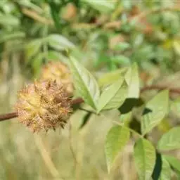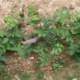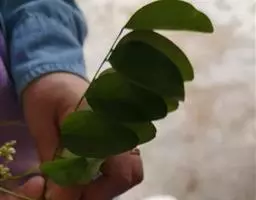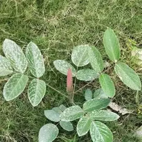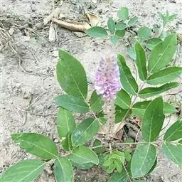 叶多为3小叶,稀兼有单小叶;托叶三角形,长3毫米,宽约1毫米,先端尾尖,被灰黄色长柔和缘毛;叶柄长1-2厘米,有沟槽;小叶纸质,顶生小叶近圆形或椭圆形至卵形,长2-6厘米,宽1.5-3厘米,先端圆形或微凹,有细尖,基部圆形或心形,侧生小叶较小,上面略粗糙,下面被灰黄色短柔毛,侧脉每边5-7条,直而斜展,靠叶缘处微弯拱,两面凸起,网脉在下面明显;小托叶刚毛状,长1.5毫米;小叶柄长约2毫米,密被灰黄色短柔毛。