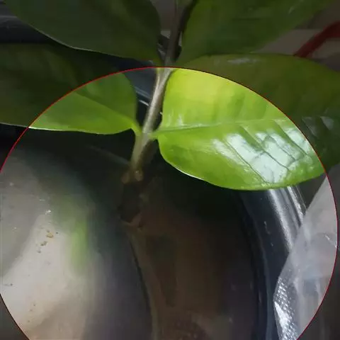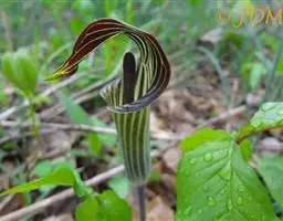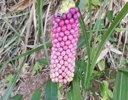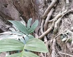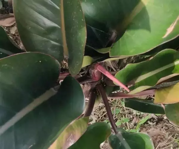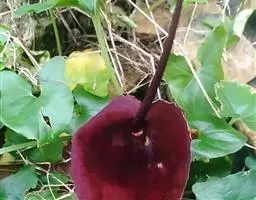 攀援植物,分枝节间淡红色,长3-8厘米,粗1厘米。鳞叶肉质,红色,背面有2条龙骨状突起,长7-10厘米。叶柄腹面扁平,背面圆形,长15-25厘米,粗7-10毫米;叶片纸质,伸长的三角状箭形,长15-25厘米,宽12-18厘米,基部心形,前裂片三角形、半圆形或半卵形,后裂片三角形,I级侧脉4对基出,II级侧脉多数。花序柄长6-7厘米。佛焰苞外面深紫色,内面胭脂红色,兜状舟形,管部卵圆形,长7-8厘米;檐部短卵形,长7厘米,宽4-5厘米,具长约5毫米的尖头,肉穗花序具长约3毫米的梗,雌花序圆柱形,长5厘米,粗1.5厘米,雄花序长10厘米,向上略细。雌蕊倒卵圆形,8室,长约1.5毫米,柱头盘状。雄花通常有雄蕊3。