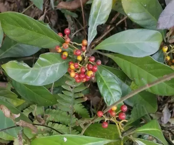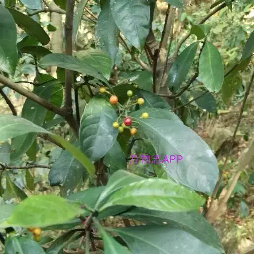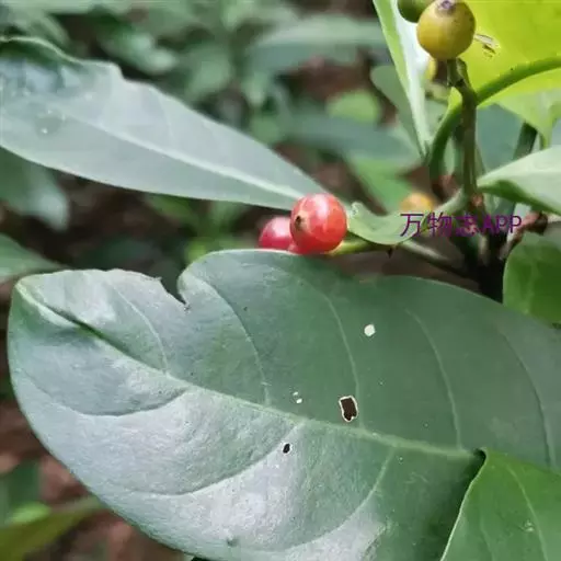 2、灌木或小乔木,高0.5-5米。叶对生,纸质或革质,长圆形、椭圆状长圆形或倒披针状长圆形,稀长圆状倒卵形,有时稍歪斜,长5-23.5厘米,宽2-9厘米,顶端渐尖、急渐尖或短尖而尖头常钝,基部楔形,全缘,鲜时稍光亮,干时常暗红色或在下面褐红色而上面淡绿色,中脉和侧脉在上面凹下,在下面凸起,脉腋内常有束毛,侧脉5-15对,弯拱向上,近叶缘处不明显联结;叶柄长0.7-5厘米,无毛或极稀有极短的柔毛;托叶膜质,短鞘状,顶部不裂,长6-8毫米,宽6-9毫米,脱落。聚伞花序通常顶生,无毛或极稀有极短的柔毛,多花,总花梗常极短,近基部三分歧,常成伞房状或圆锥状,长2-10厘米,宽3-15厘米;花梗长1-2.5毫米;萼管杯状,长约2毫米,宽约2.5毫米,檐部扩大,近截平或不明显地5齿裂;花冠白色,冠管长2-3毫米,宽约2.5毫米,喉部被白色长柔毛,花冠裂片近三角形,长2-2.5毫米,宽约1.5毫米,开放时反折;雄蕊与花冠裂片互生,花药长圆形,伸出,花丝长1-2毫米;柱头2裂,伸出或内藏。核果球形或宽椭圆形,长5-8毫米,直径4-7毫米,有纵棱,红色;果柄长1.5-10毫米;小核背面凸起,具纵棱,腹面平而光滑。花果期全年。
