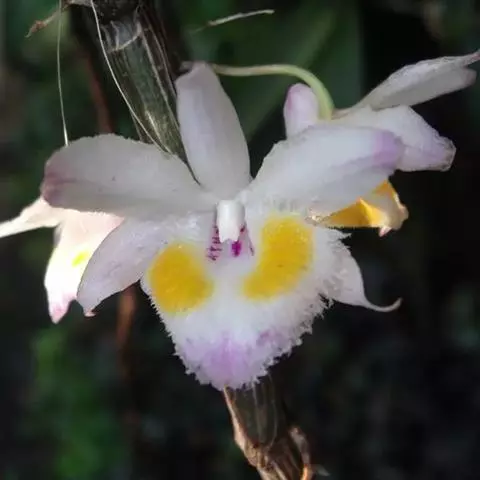 总状花序通常数个,出自落了叶或具叶的老茎上部,花序轴纤细,长1.5-4厘米,多少回折状弯曲,疏生1-6朵花;花序柄长5-10毫米,基部被3-4枚长2-3毫米的膜质鞘;花苞片膜质,卵状披针形,长5-7毫米,先端急尖;花梗和子房长约1.5厘米;花开展,萼片和花瓣淡粉红色;中萼片长圆状披针形,长1.6-2厘米,宽7毫米,先端锐尖,具5条脉;侧萼片斜卵状三角形,与中萼片等长而宽得多,先端急尖,具5条脉,基部歪斜;萼囊明显坛状,长约1厘米。