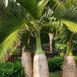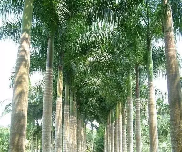 王棕(学名:Roystonea regia (H.B.K)O.F.Cook):又名大王椰子。乔木;单干,直立叶痕不明显,叶簇生于干顶,叶片大,长达3米以上,叶鞘长大,羽状全裂,羽叶狭长柔软,列序不甚整齐,深绿色。干粗壮雄伟,中下部膨大,呈佛肚状,径达40厘米以上,确为棕类之王,是显示热带壮丽风光的典型树种,