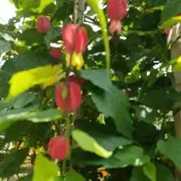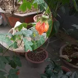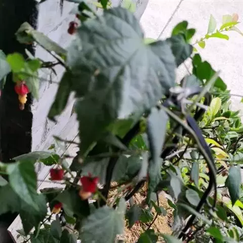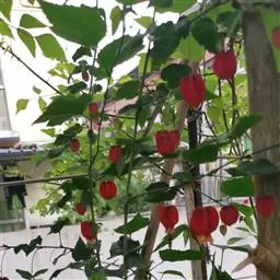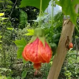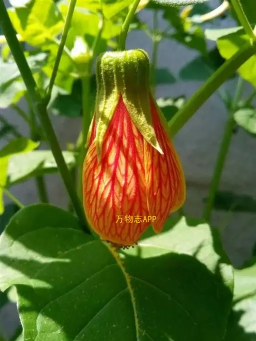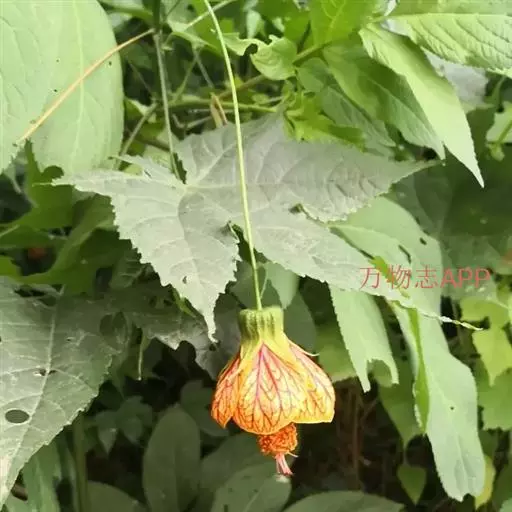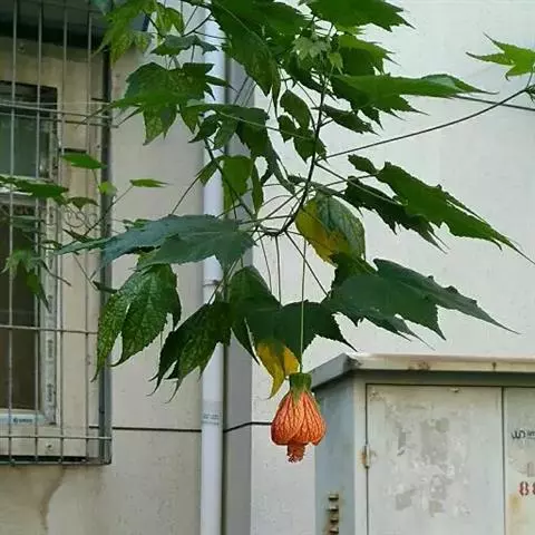 金铃花(学名:Abutilon striatum),又名灯笼花、网花苘麻、红脉商麻,属于常绿灌木,由于叶片常绿、花形独特、花期较长、易于繁殖,颇受喜爱。金铃花系丛生,茎直立,叶翠绿,质厚,卵状,亦有掌状,边缘有锯齿,花梗细长,小蕾期向上,随着蕾的膨大逐渐向下,开花特别下垂,花钟形,橙黄色,上有鲜艳的紫红色脉纹,花蕊和花柱较长,伸出花冠之外,整花如吊着的金色铃子而得名。