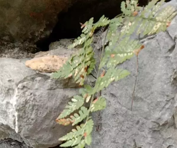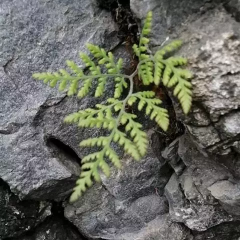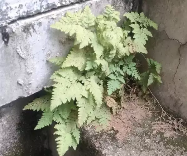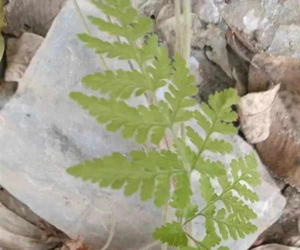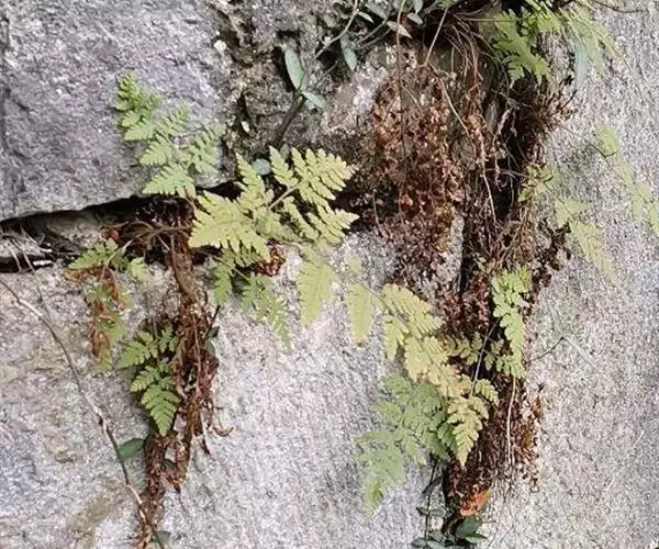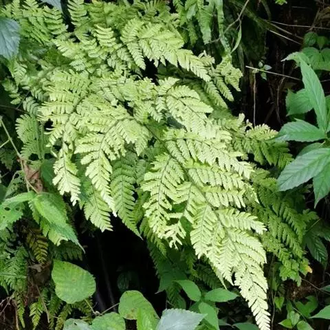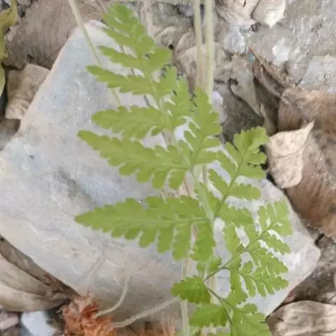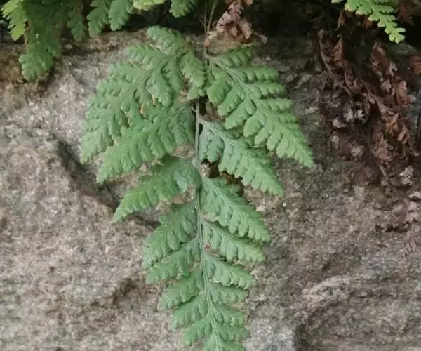 植株高(12-)20-50(-60)厘米。根状茎粗壮,横走,连同叶柄基部密被鳞片;鳞片长0.5-3厘米,狭披针形,先端渐狭成线形,全缘,膜质,亮红棕色。叶近生,柄长(5-)10-25(-30)厘米,粗1-3毫米,禾秆色,基部有时疏被较小的狭披针形鳞片,向上仅被灰白色柔毛;叶片长(7-)20-30厘米,基部宽(6-)18-30厘米,卵状五角形,先端渐尖并羽裂,基部圆心形,三回羽状;羽片8-12对,稍斜上,下部1-2对近对生,相距1.2-8厘米,向上互生;基部一对最大,长(3.5-)10-20厘米,基部宽(3-)5-10厘米,三角状长圆形,短渐尖头,基部心形,柄长(2-)5-10毫米,二回羽状;一回小羽片6-10对,上先出,互生,稍斜上,彼此接近,羽轴下侧的较上侧的为大,尤以基部一片最大,长(1.5-)3-7厘米,基部宽(1-)2-5厘米,卵状三角形,短渐尖头,基部近截形,下延成具狭翅的短柄,一回羽状;末回小羽片长(0.5-)1.5-2.5厘米,基部宽0.5-1厘米,长圆形,先端钝尖,基部多少与小羽轴合生,羽状深裂;裂片长圆形,先端圆钝,边缘全缘或略成波状;基部一对羽片的上侧小羽片长1-4厘米,基部宽0.5-2厘米,卵状三角形至长圆形,先端急尖,基部近平截,以狭翅下延,一回羽状深裂;第二对以上各对羽片向上渐次缩短,披针形或长圆披针形,先端短钝尖,基部圆截形或为浅心形,具短柄,二回羽裂;羽轴两侧的小羽片近等大。叶脉两面明显,侧脉羽状,单一,每末回裂片2-3对,斜上,伸达叶边;叶草质,干后黄绿色,两面连同叶轴和各回羽轴密被灰白色柔毛;羽轴下面偶有红棕色的线状披针形的狭鳞片。孢子囊群圆形,背生于侧脉中部,每裂片1-3枚;囊群盖大,肾形,浅灰色,膜质,背面密被柔毛,宿存。孢子深棕褐色,二面体形,单裂缝,赤道面观为肾形,极面观呈椭圆形,圆肾形,周壁具较密的褶皱,形成明显的弯曲条纹,表面光滑。孢子大小为46微米×56微米。 [2-3]