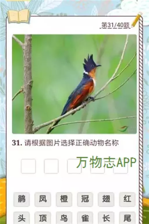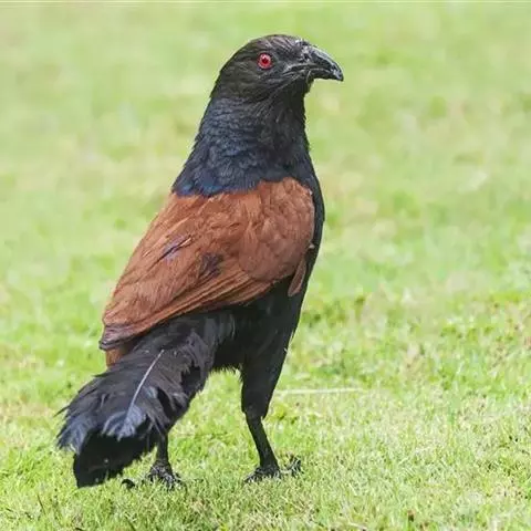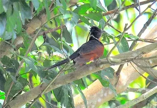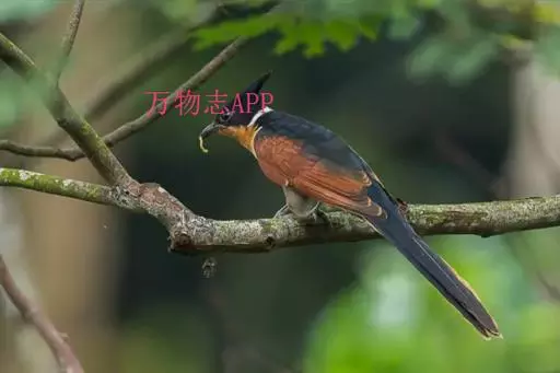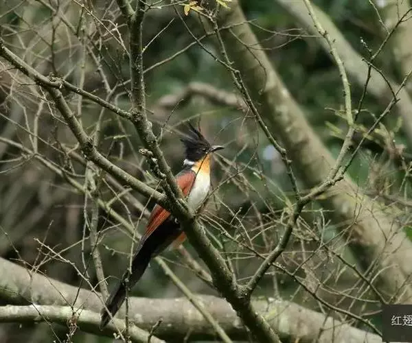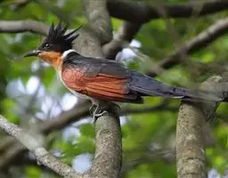 红翅凤头鹃(学名:Clamator coromandus):体长约38厘米,顶冠及凤头黑色,具显眼的直立凤头,背及尾黑色而带蓝色光泽,翅栗红色,喉及胸橙褐色,颈圈白色,腹部近白。虹膜淡红褐色。嘴黑色,下嘴基部近淡土黄色,嘴角肉红色,脚铅褐色。幼鸟上体褐色,具棕色端缘,下体白色。