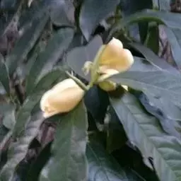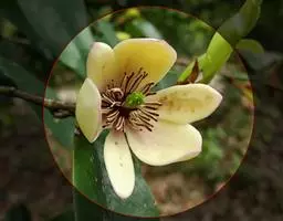 花杂性,雄花两性花异株;雄花:花被片9-14,外轮3-4片浅黄色,倒卵状长圆形,长2.5-3.5厘米,宽1.2-2.5厘米,内2-3轮白色,较狭少;雄蕊30-70枚,雄蕊长9-11毫米,花药长8-10毫米,花丝长1-2毫米,药隔伸出成短尖,花丝及药隔紫红色;有时具1-5心皮的两性花、雄花花托顶端长锐尖、有时具雌蕊群柄,两性花:花被片与雄花同形而较小,雄蕊10-35枚,雌蕊群卵圆形,绿色,具雌蕊10-20枚。