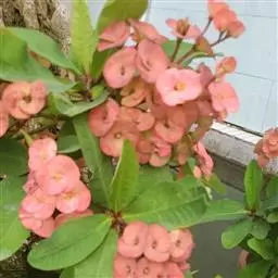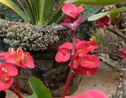 虎刺梅:别称铁海棠,是蔓生灌木植物。茎多分枝,长60-100厘米,直径5-10毫米,具纵棱,密生硬…