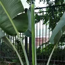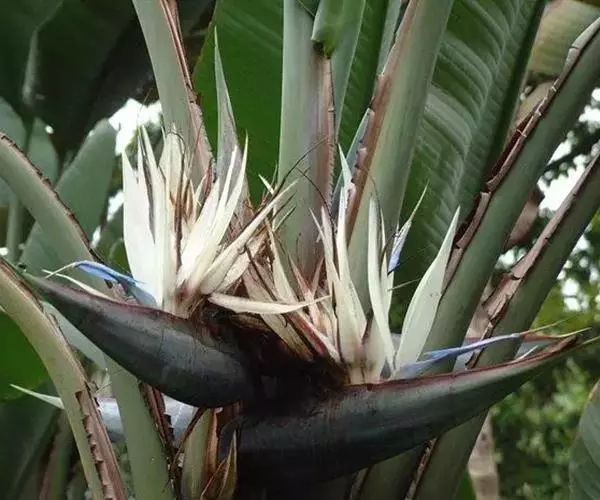 大鹤望兰(Strelitzia nicolai Begel et Koern.),姜目旅人蕉科鹤望兰属植物。茎干高达8米,木质。叶长圆形,基部圆并偏斜;叶柄长1.8米。花序有2枚大型佛焰苞;佛焰苞绿色但染红棕色,舟状,内有4-9花。花梗长2-3厘米;萼片披针形,白色,下方的1枚背生龙骨状脊突;箭头状花瓣长10-12厘米,中部稍收窄,天蓝色,中央花瓣极小,长圆形;雄蕊线形,长约5厘米;花柱线形,柱头3裂。