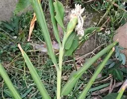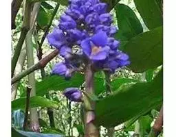 花序腋生,总花梗较叶柄为短,花序上通常有2个大型佛焰苞,佛焰苞绿色而染红棕色,舟状,长25-32厘米,顶端渐尖,内有花4-9朵,花梗长2-3厘米;萼片披针形,白色,长13-17厘米,宽约1.5-3厘米,下方的1 枚背具龙骨状脊突,箭头状花瓣天蓝色,长10-12厘米,中部稍收狭,基部戟形,中央的花瓣极小,长圆形,长6-10毫米;雄蕊5枚,线形,长约5厘米;花柱线形,长16-20厘米,柱头3裂。 [2-3]