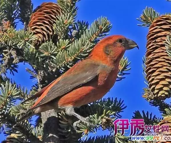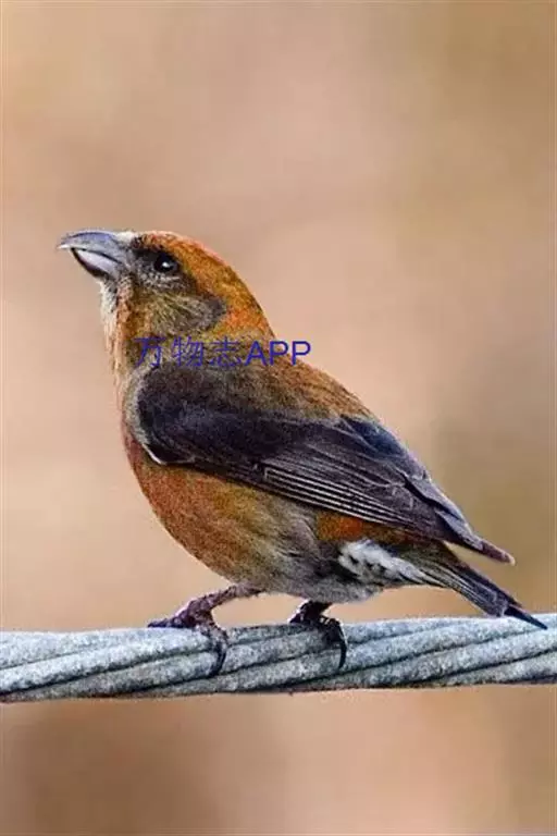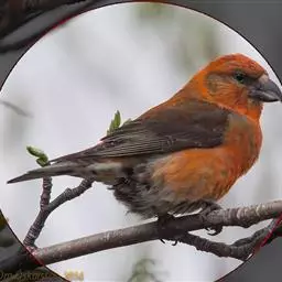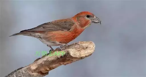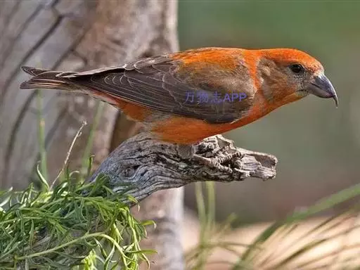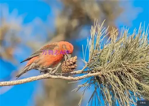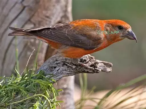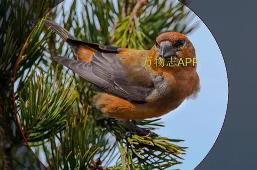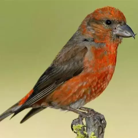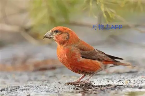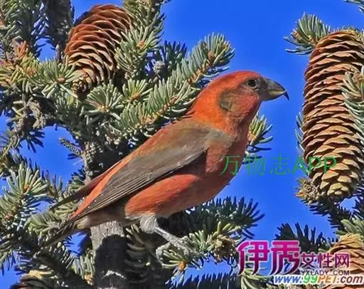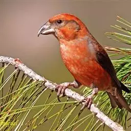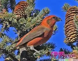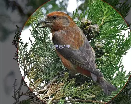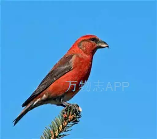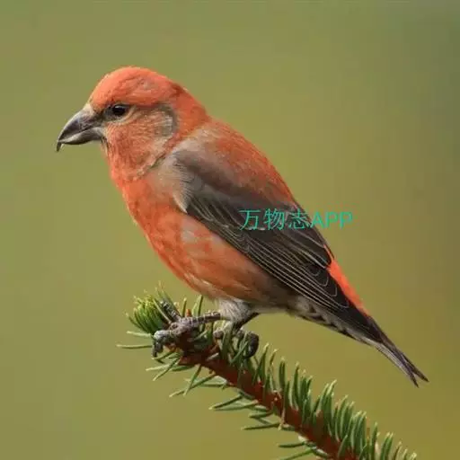 红交嘴雀(学名:Loxia curvirostra):体重28-48克,体长145-175毫米。是燕雀科交嘴雀属的鸣禽。是一种小型的燕雀。雄鸟通体砖红色,上体较暗,腰鲜红色;翼和尾近黑色,头侧暗褐色;雌鸟暗橄榄绿或染灰色,腰较淡或鲜绿色;头侧灰色。两性均具粗大而尖端相交叉的嘴。与除白翅交嘴雀外的所有其它雀类的区别为上下嘴相侧交。繁殖期雄鸟的砖红色随亚种而有异,从橘黄至玫红及猩红,但一般比任何朱雀的红色多些黄色调。红色一般多杂斑,嘴较松雀的钩嘴更弯曲。雌鸟似雄鸟但为暗橄榄绿而非红色。虹膜深褐色,嘴近黑色,脚近黑色。