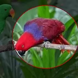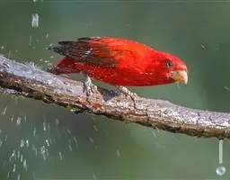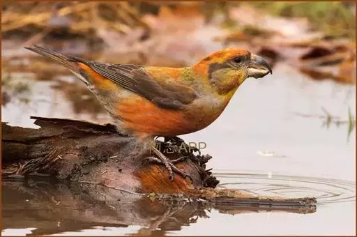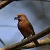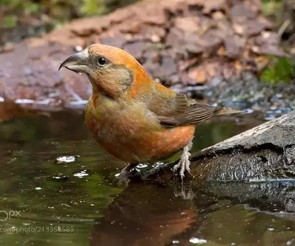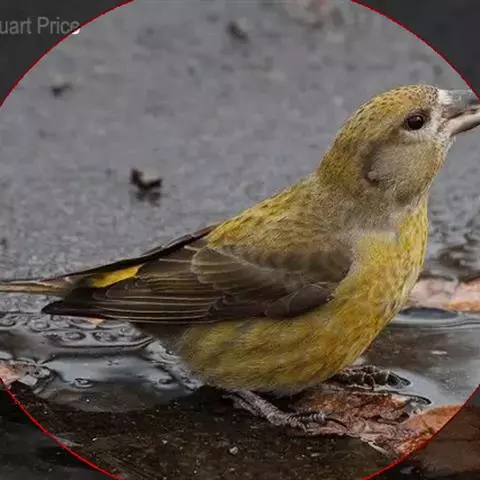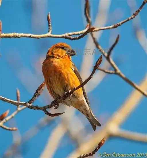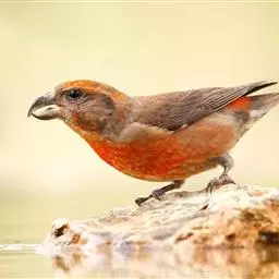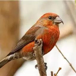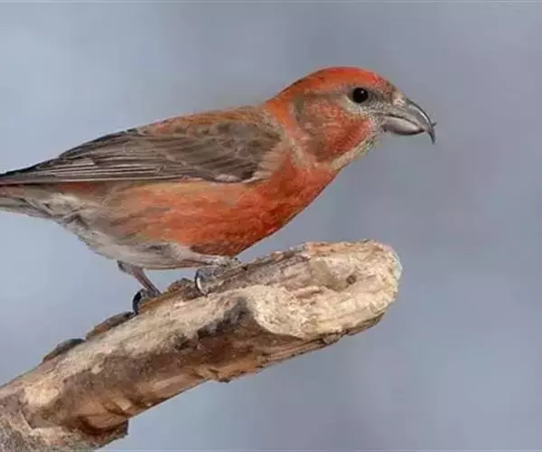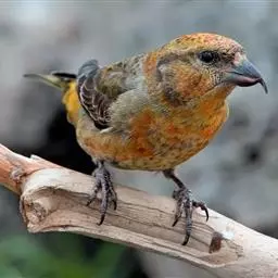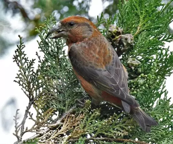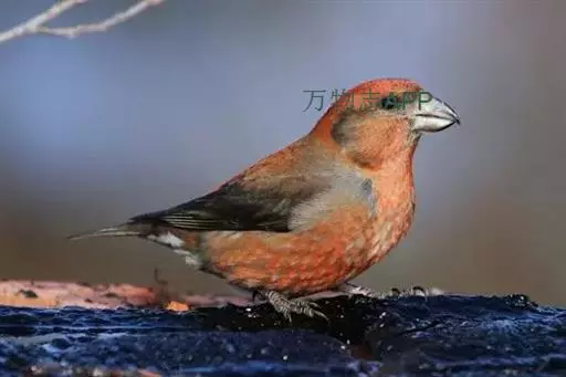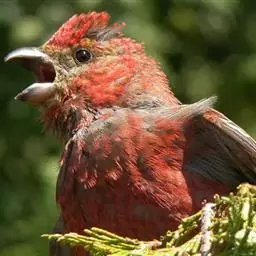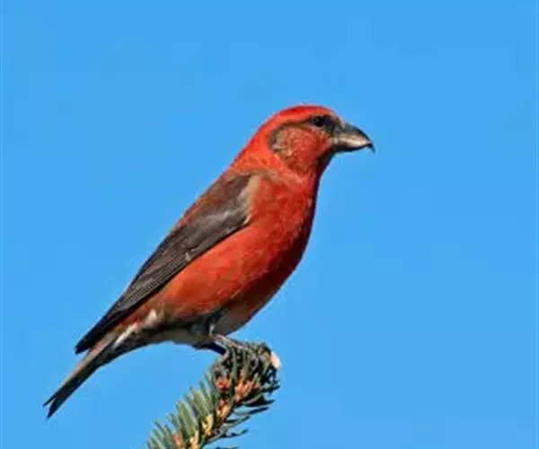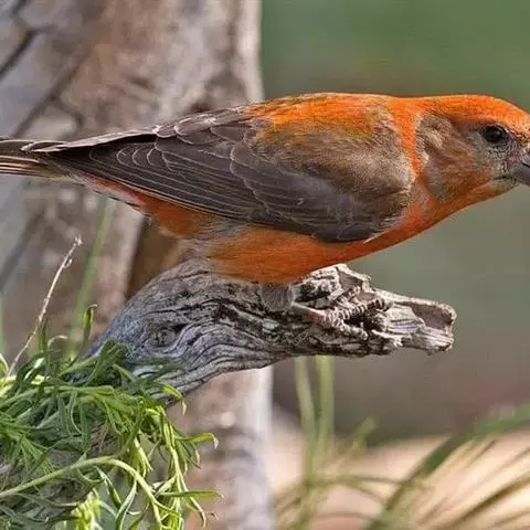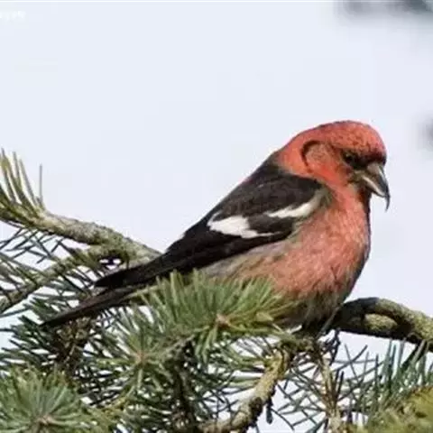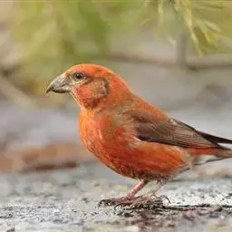 红交嘴雀(学名:Loxia curvirostra):体重28-48克,体长145-175毫米。是燕雀科交嘴雀属的鸣禽。是一种小型的燕雀。雄鸟通体砖红色,上体较暗,腰鲜红色;翼和尾近黑色,头侧暗褐色;雌鸟暗橄榄绿或染灰色,腰较淡或鲜绿色;头侧灰色。两性均具粗大而尖端相交叉的嘴。与除白翅交嘴雀外的所有其它雀类的区别为上下嘴相侧交。繁殖期雄鸟的砖红色随亚种而有异,从橘黄至玫红及猩红,但一般比任何朱雀的红色多些黄色调。红色一般多杂斑,嘴较松雀的钩嘴更弯曲。雌鸟似雄鸟但为暗橄榄绿而非红色。虹膜深褐色,嘴近黑色,脚近黑色。
