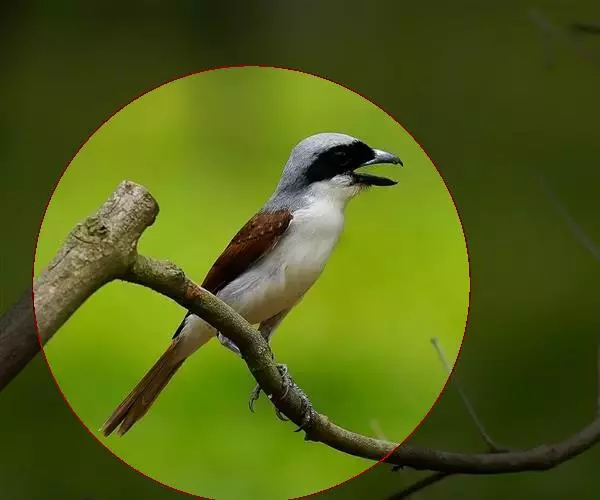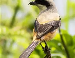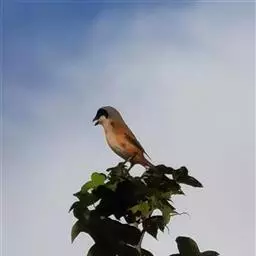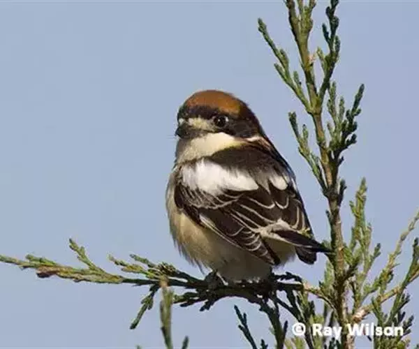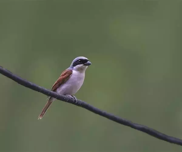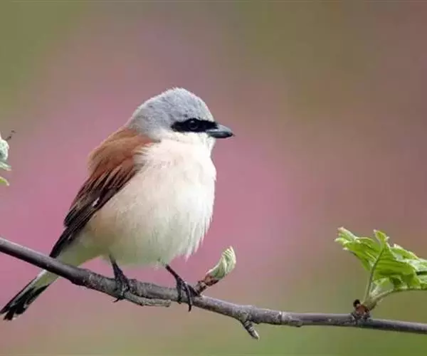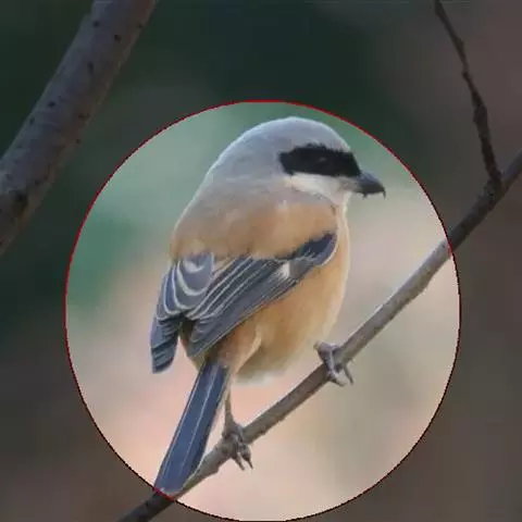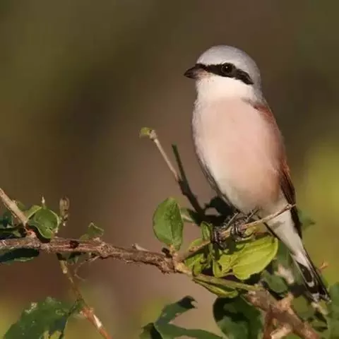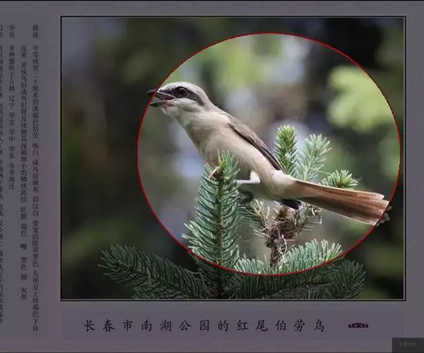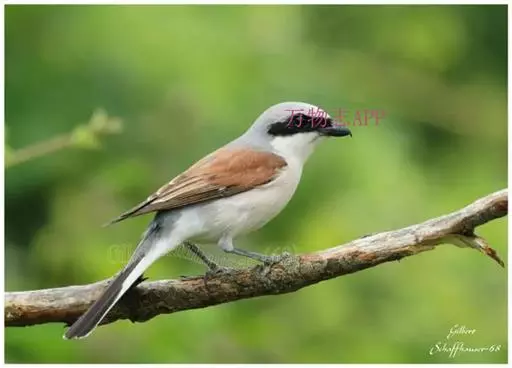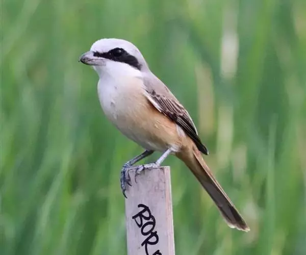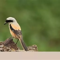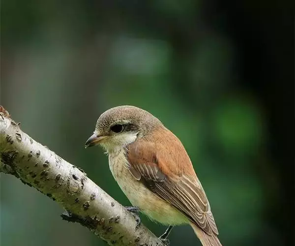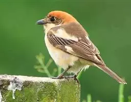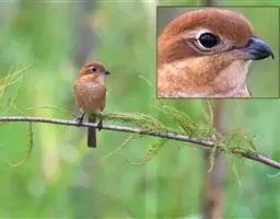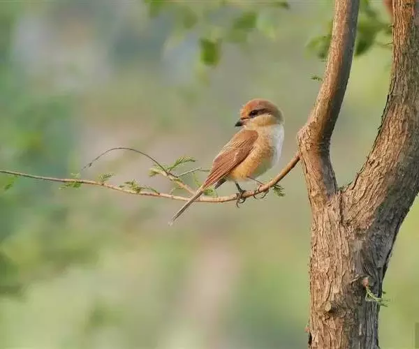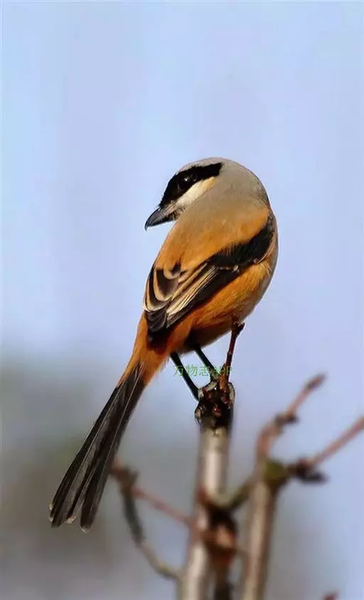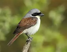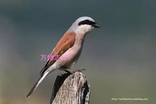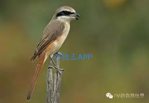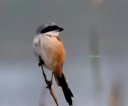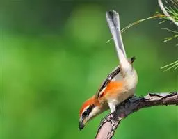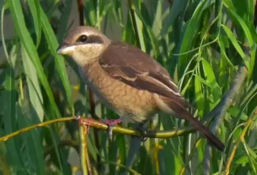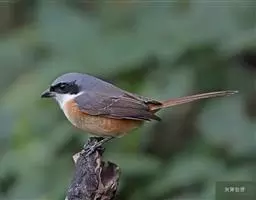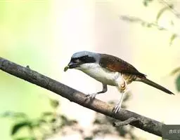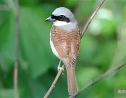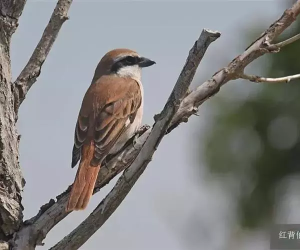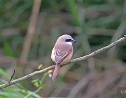 红尾伯劳 主要特点是额和头顶前部淡灰色,背面大部呈灰褐色,腹面棕白而无杂斑。头侧具穿过眼部的黑色宽带纹,尾羽呈棕红色。平时栖息于平原或山地的小树或灌木的顶枝上,性格凶猛,举目张望四周,一见有昆虫或其他食饵,即急飞直下而抓住它,然后再返回所栖的树枝上。性贪食。鸣声粗厉响亮,叫时仰首翘尾,激昂有力。营巢活动自 5月下旬至 7月中旬 ,两性参与筑巢 ,营巢期间有求偶交配行为 ,营巢期 6~ 8d。理巢基本全由雄鸟承担,护巢性强。 巢呈粗大的杯状,由草茎、草根、草穗及梗等编成。巢大多建在阔叶树上,每窝产4~6枚乳白色卵,上面密布有深浅不一的蓝灰和黄褐色斑点。