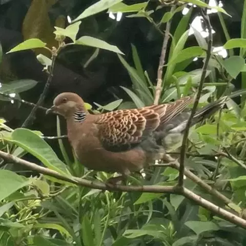 山斑鸠,是鸽形目鸽鸠科斑鸠属鸟类,又名金背斑鸠、棕背斑鸠、山鸠、金背鸠、麒麟斑、麒麟鸠、东方斑鸠、绿斑鸠、山鸽子。山斑鸠颈侧具明显黑白色条纹的块状斑,上体深褐色、具扇贝状斑纹,羽缘棕色,尾羽近黑色,下体多偏粉色。虹膜黄色,喙灰色,脚粉色。山斑鸠是留鸟,在中国常见且分布广泛。此外,还分布于不丹、尼泊尔、巴基斯坦、印度、日本等国。栖息于针阔混交林、季风常绿阔叶林、果园及农耕区,多成对活动于开阔农耕区、村舍、寺院周围及防火林带。取食于地面,主要觅食植物种子、果实、嫩芽等,也吃昆虫。山斑鸠飞翔时鼓翼快速,叫声为反复而低沉的“咕咕咕”声。繁殖期在4-7月,营巢于林中树上,通常一年繁殖2窝,窝卵数2枚,由雌雄亲鸟轮流孵卵,孵化期18~19天。山斑鸠的肉、卵可食,肉入药可益气明目、强筋壮骨,治久病气虚、衰弱无力、两目昏暗等病症。山斑鸠啄食杂草种子,对农田清除杂草有益;但有时也刨食农作物及树的种子。山斑鸠