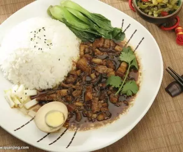 卤肉饭是江南一带的传统名小吃,制作原料主要有猪五花肉、鹌鹑蛋、米饭等,肥而不腻、甜咸适口、香浓四溢。带有厚重口感的卤肉,配上一碗蒸的不软不硬的白饭,每一粒米都吸透黑红的汤汁。