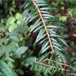 叶条形,在侧枝上排列成二列状,或枝条下面之叶排列成两列,上面之叶斜展至直伸,其长度由下面两侧至上面中央递减,长1-4.2(通常为1.5-3.5)厘米,宽2.5-3.5毫米,先端有凹缺,下面有两条白色气孔带;横切面有2个边生树脂道或生于两侧端的叶肉薄壁组织内,上面至下面两端及下面中部有一层连续排列的皮下层细胞;幼枝之叶在枝上常呈两列,先端呈二尖裂。雌球花圆柱形,长3-3.5厘米,径约8毫米,苞鳞上部向后反曲。