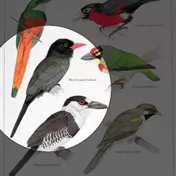 咬鹃共有1科6属39种,属小型攀禽。异趾形,1、2趾向后,3、4趾向前。羽色艳丽,具金属光泽。…