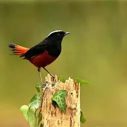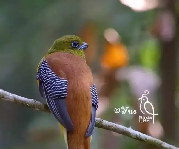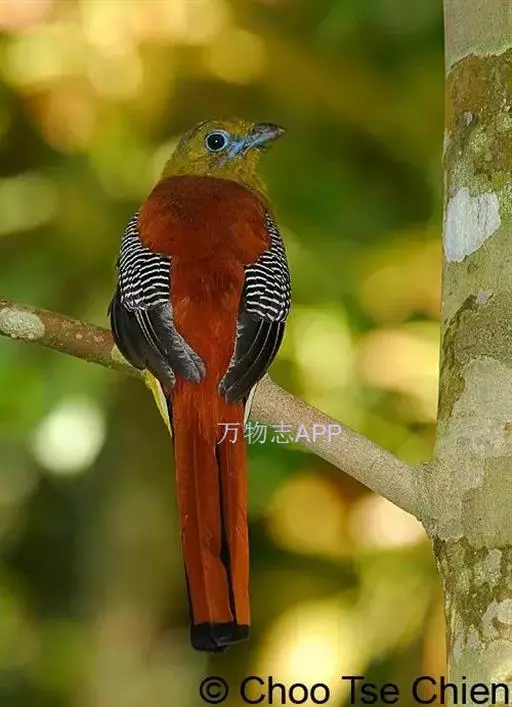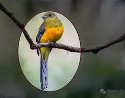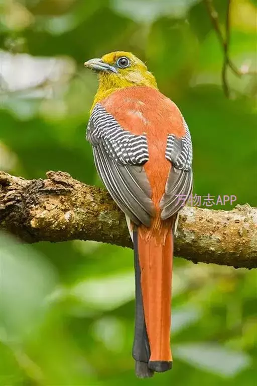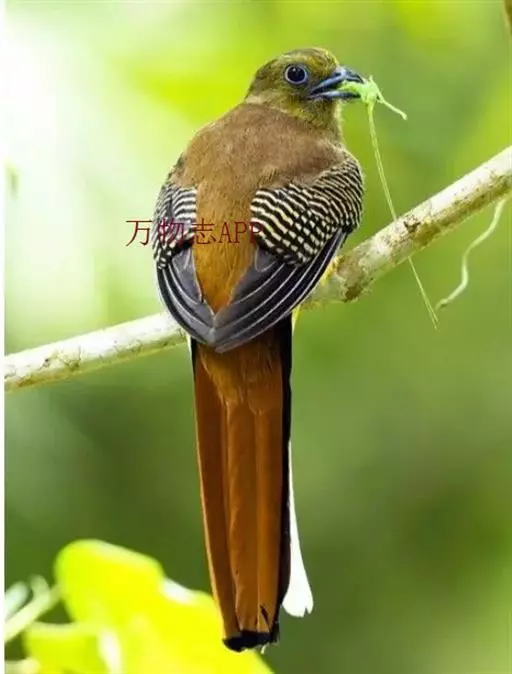 橙胸咬鹃:全长约28厘米。雄鸟头、颈橄榄绿色,上体及中央尾羽栗色;中央尾羽具黑色端,…