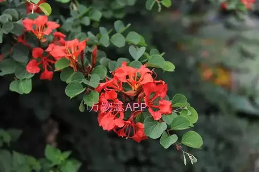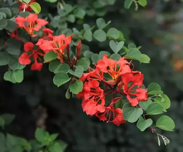 嘉氏羊蹄甲枝条细软,枝极平整,向四周匍匐伸展,冠幅常大于高度。叶呈双肾型,十分特别。花序簇生枝头,花大量,颜色橙红似火,花姿花色美妍悦目。