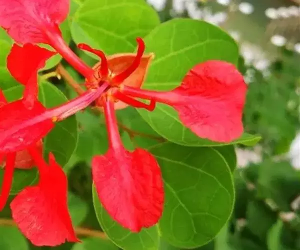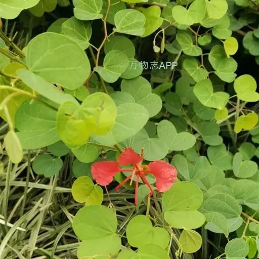 常绿攀援灌木,植株整体比较矮小;小枝顶端被微柔毛; 无卷须;叶坚纸质,宽明显大于长;先端 2 裂达叶长的的 1/5 ~ 1/2,裂片顶端钝圆;叶柄被微茸毛;聚伞花序伞房状,侧生,被锈色柔毛;花萼开花时向外反折;花瓣红色,倒匙形,有瓣柄;能育雄蕊 3 枚,退化雄蕊 7 枚;荚果长圆形,果瓣较厚,无毛;种子扁平,有光泽,直径约 8 mm;花期 4 ~ 11月;果期 7 ~ 12 月。