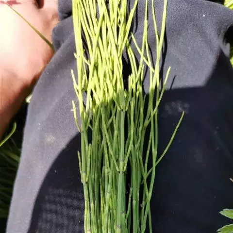 基部扁平或弧形,早落或宿存,齿上气孔带明显或不明显。侧枝较硬,圆柱状,孢子囊穗短棒状或椭圆形,长0.5-2.5厘米,中部直径0.4-0.7厘米,顶端有小尖突,无柄性状呈长管状,不分枝,长40~60cm,直径0.2~0.7cm。表面灰绿色或黄绿色,有18~30条纵棱,棱上有多数细小光亮的疣状突起;节明显,节间长2.5~9cm,节上着生筒状鳞叶,叶鞘基部和鞘齿黑棕色,中部淡棕黄色。体轻,质脆,易折断,断面中空,周边有多数圆形的小空腔。气微,味甘淡、微涩,嚼之有沙粒感。