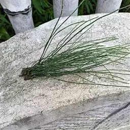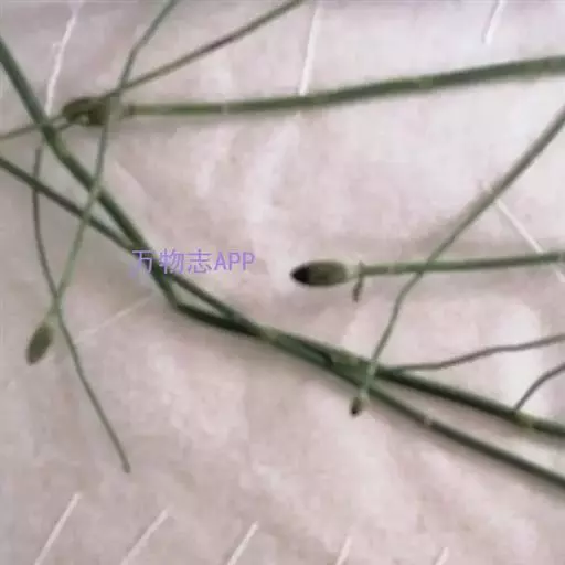 笔管草 笔管草、纤弱木贼、台湾木贼 属于大中型植物 。根茎直立和横走,黑棕色,节和根密生黄棕色长毛或光滑无毛。地上枝多年生。枝一型。高可达60厘米或更多,中部直径3-7毫米,节间长3-10厘米,绿色,成熟主枝有分枝,但分枝常不多。主枝有脊10-20条,脊的背部弧形,要一行小瘤或有浅色小横纹;鞘筒短,下部绿色,顶部略为黑棕色;鞘齿10-22枚,狭三角形,上部淡棕色,膜质,早落或有时宿存,下部黑棕色革质,扁平,两侧有明显的棱角,齿上气孔带明显或不明显。侧枝较硬,圆柱状,有脊8-12条,脊上有小瘤或横纹;鞘齿6-10个,披针形,较短,膜质,淡棕色,早落或宿存。孢子囊穗短棒状或椭圆形,长1-2.5厘米,中部直径0.4-0.7厘米,顶端有小尖突,无柄。