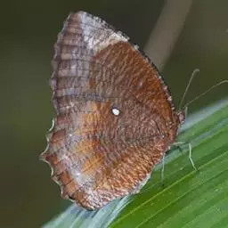 前翅外缘和后翅外缘突出成角状。前翅近顶角有1黑色圆斑,斑内和纹上各有1个白点,…