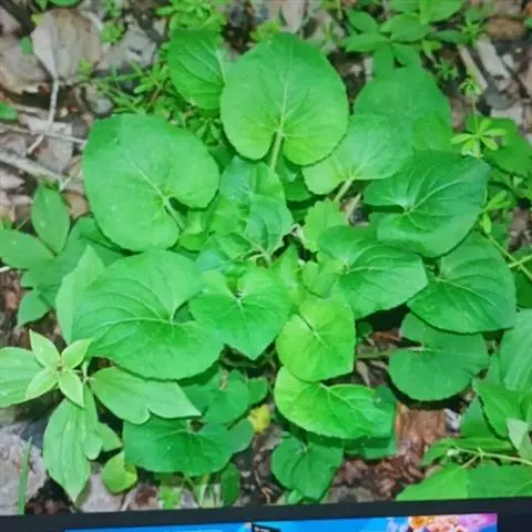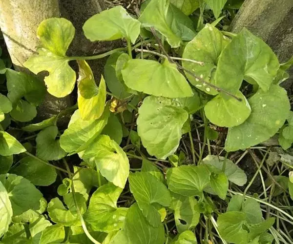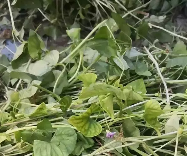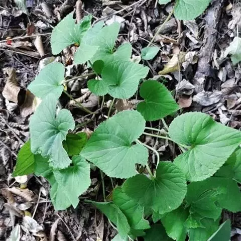多皱缩成团。根茎上有细根,基生叶多,具长柄,茎生叶有托叶,托叶小披针形。叶片湿润展平后,宽心形或近新月形,边缘有波状圆齿,深绿色。花基生或茎生叶腋生,淡棕紫色。蒴果较小椭圆形,长约8mm。气微,味微苦。