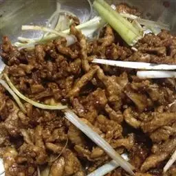 1.仔姜洗净切成均匀细丝,小红辣椒切段,小香葱切段。牛肉去筋膜,逆丝切成均匀较细的丝,加少许盐、生抽、胡椒粉、糖、蚝油、干淀粉一起用手抓匀,反复的抓捏让肉吸收水分变得有弹性。