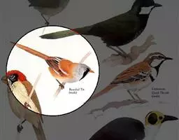 褐头凤鹛小型鸟类,体长12~13厘米。头顶有可竖立的红褐色羽冠,头侧、枕、颊、喉和下体白色,…