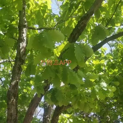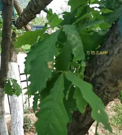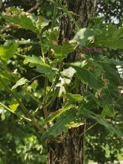 蒙古栎属落叶乔木,高达30米,树皮灰褐色,纵裂。幼枝紫褐色,有棱,无毛。顶芽长卵形,微有棱,芽鳞紫褐色,有缘毛。叶片倒卵形至长倒卵形,长7-19厘米;宽3-11厘米,顶端短钝尖或短突尖,基部窄圆形或耳形,叶缘7-10对钝齿或粗齿,幼时沿脉有毛,后渐脱落,侧脉每边7-11条;叶柄长2-8毫米,无毛。