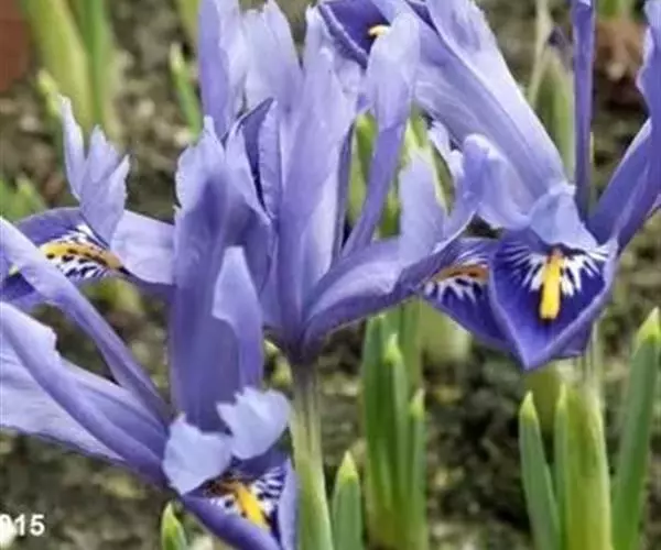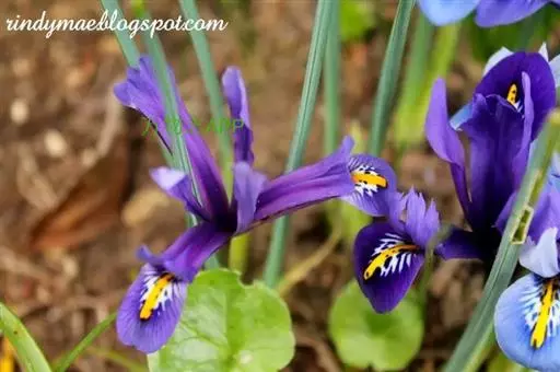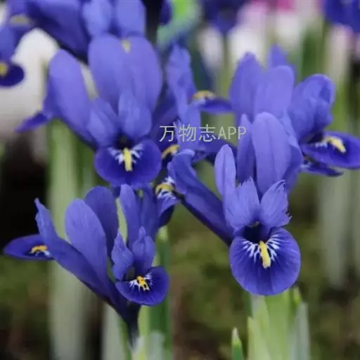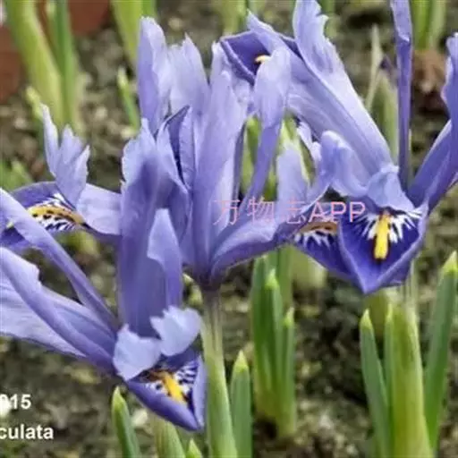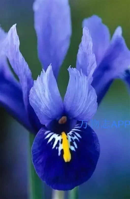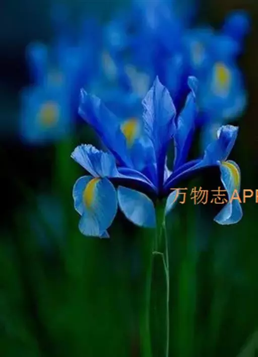 花茎短,一般不伸出地面;苞片2-3枚,草质,绿色,狭披针形,长6-8厘米,宽0.8-1厘米,顶端长渐尖,其中包含1-2朵花;花蓝色带有黄斑,直径约3厘米;花梗较短,长约1.5厘米;花被管细长,长4-5 厘米,外花被裂片狭倒披针形,长约3厘米,宽约5毫米,上部向外反折,爪部狭楔形,呈沟状,内花被裂片狭倒披针形,长约2厘米,宽2-3毫米,直立;雄蕊长1.5-1.8厘米,花药黄色或黄褐色;花柱分枝较花被裂片略短而狭,顶端裂片丝状,狭三角形,子房细圆柱形,长约1厘米。蒴果长圆形,长约2厘米,直径7-8毫米,有6条突起的肋,顶端有短喙。花期5月,果期6-8月。