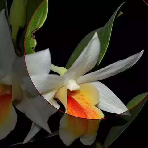 花瓣紫红色,倒卵状楔形,长1.1-1.5毫米,宽约1毫米,先端截形而其中央凹缺,具1条脉;唇瓣匙形,3裂;侧裂片紫红色,直立,半卵形,长1.5毫米,宽约1毫米;中裂片白色,厚肉质,匙形,向前伸展,长2-2.5毫米,宽1.7-2.1毫米,先端钝,基部具短爪;距紫红色,与子房平行,圆锥形,长约2毫米,粗1.5毫米,末端钝;距口前方具1个肉质舌状物伸入距内;蕊柱黄褐色,长约0.8毫米;蕊喙2裂,其裂片很短小,先端钝;药帽黄褐色,前端伸长为先端钝并且向上翘起的三角形。