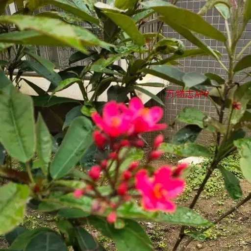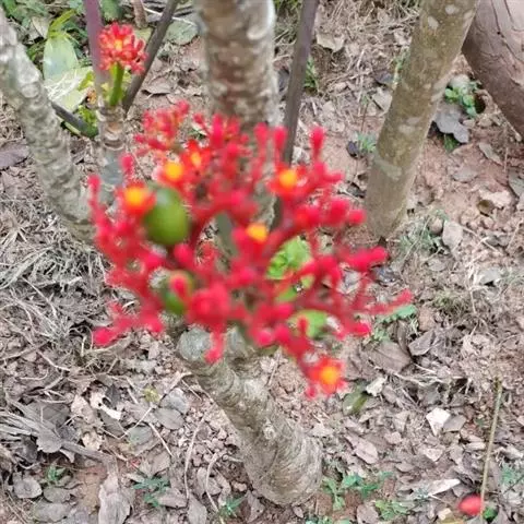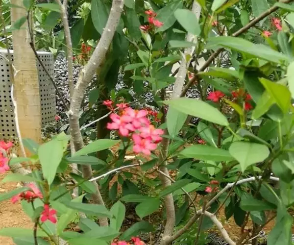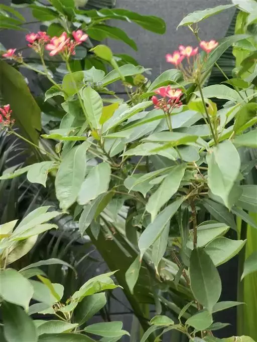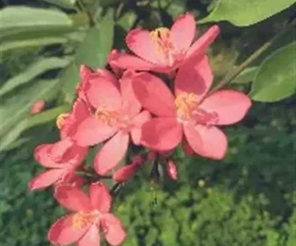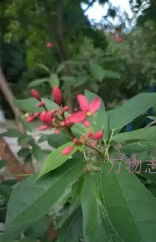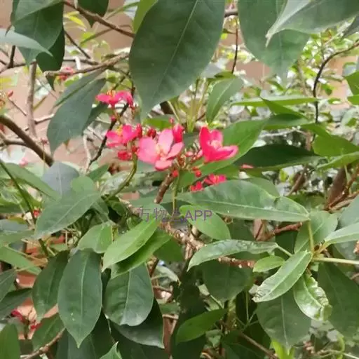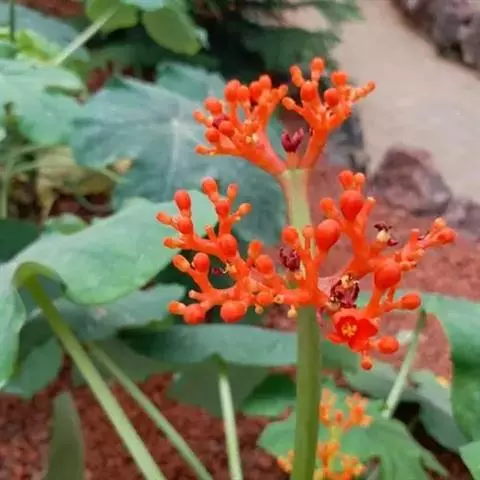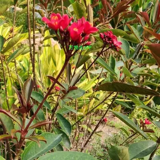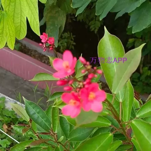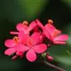 聚伞花序,花瓣5片,花冠红色;且为单性花,雌雄同株,自着生于不同的花序上;另有粉红品种。蒴果成熟时呈黑褐色。