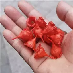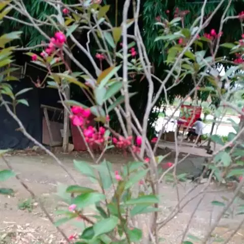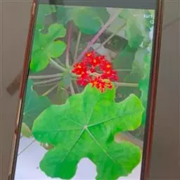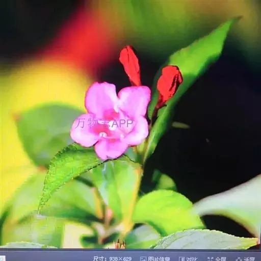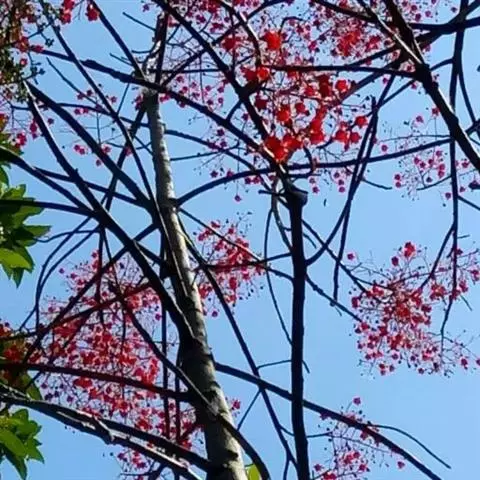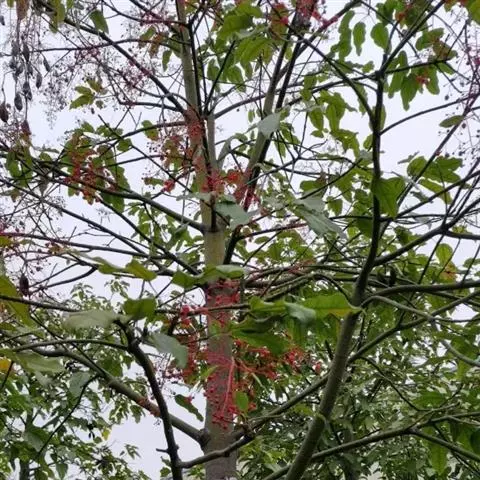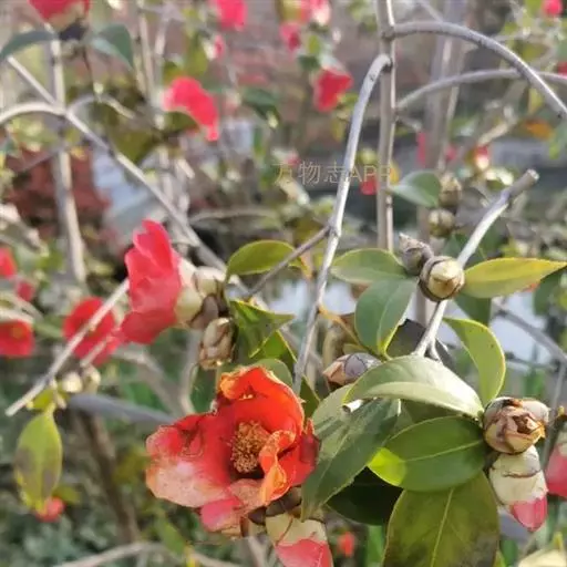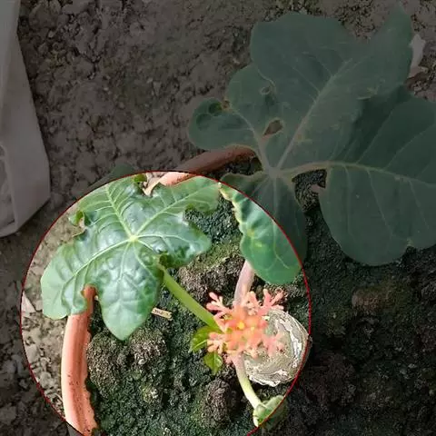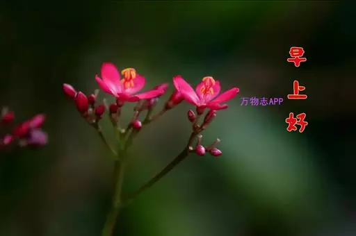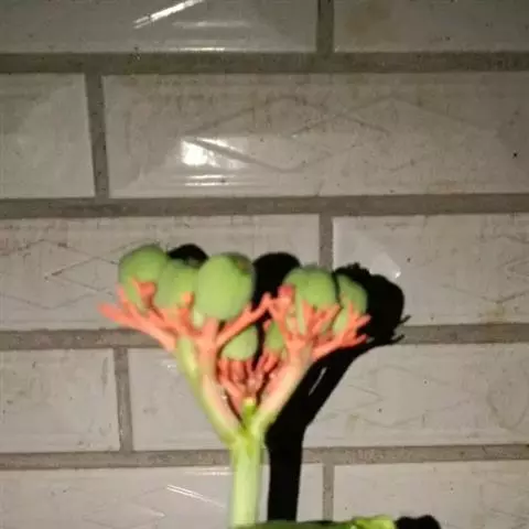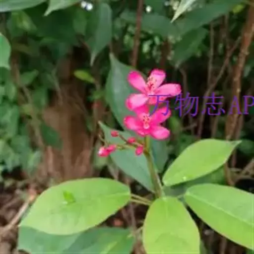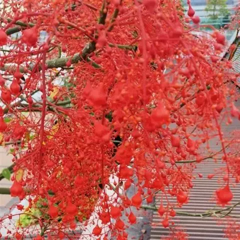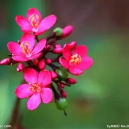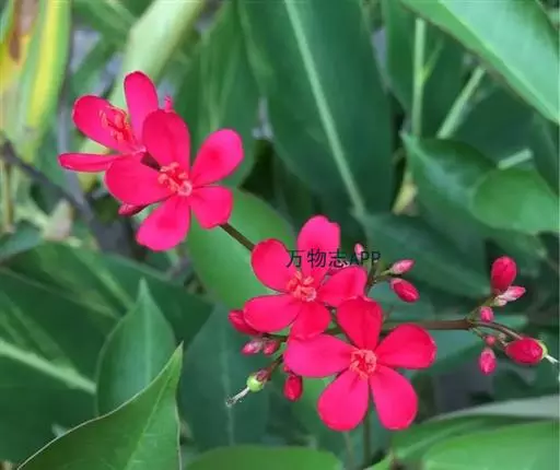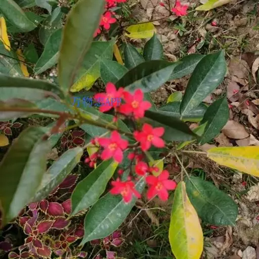 聚伞花序,花瓣5片,花冠红色;且为单性花,雌雄同株,自着生于不同的花序上;另有粉红品种。蒴果成熟时呈黑褐色。