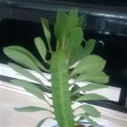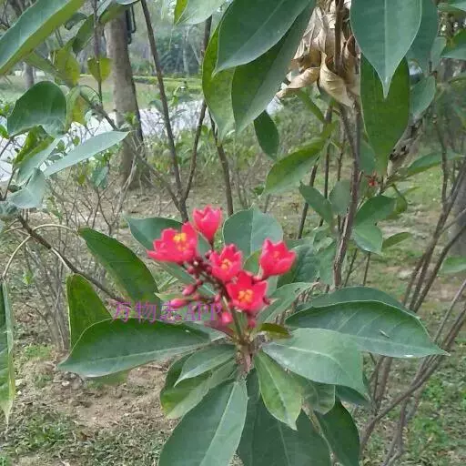 常绿灌木,花红色,植物体有乳汁,乳汁有毒。单叶互生,倒阔披针形,常丛生于枝条顶端。叶基有2-3对锐刺,叶端渐尖,叶面为浓绿色,叶背为紫绿色,叶柄具茸毛,叶面平滑。