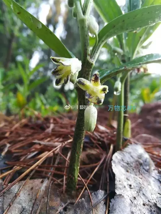 花1-2朵生于叶腋,黄绿色,多少具黑色斑点,俯垂;花被钟形,长10-14毫米;花被筒长约为花被全长的1/3,口部不缢缩;裂片近矩圆形,副花冠裂片膜质,与花被裂片互生,披针形,长3-4毫米,先端2 深裂或2浅裂;花药长约1毫米,背部以极短花丝着生于副花冠两个裂片之间的凹缺处;雌蕊长约5毫米,花柱与子房近等长。