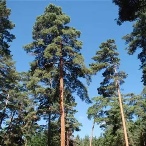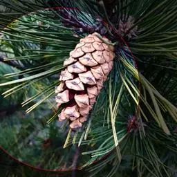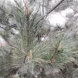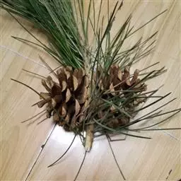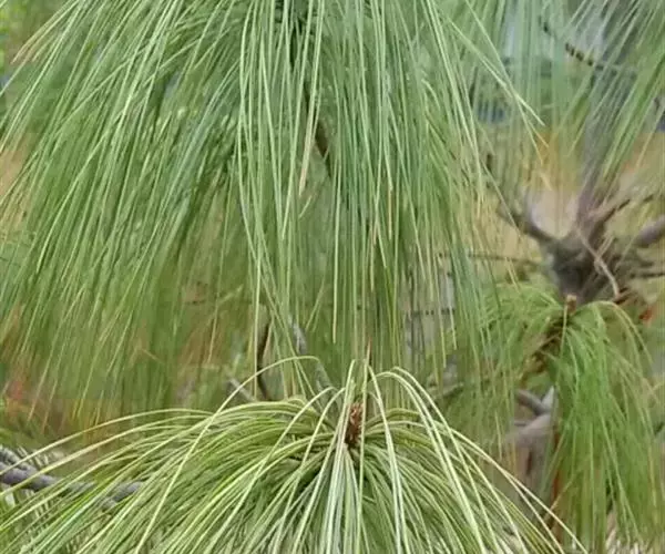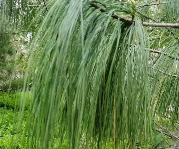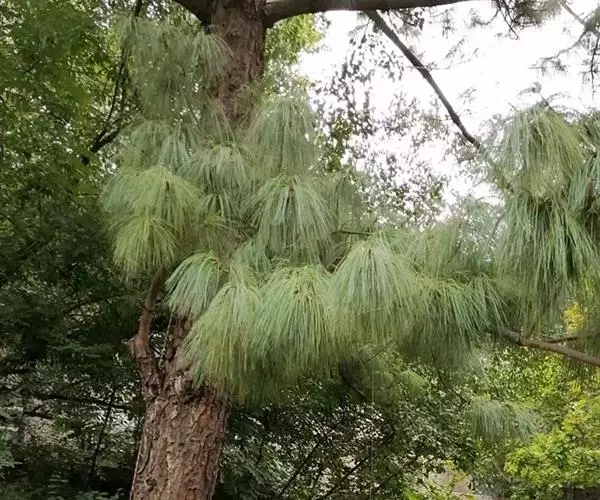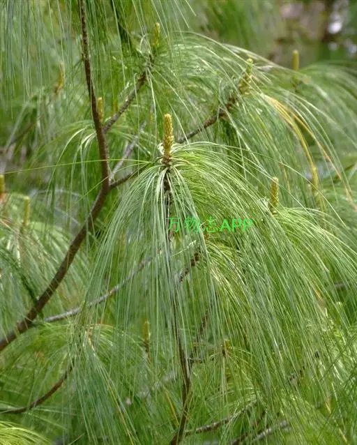 乔松 乔木,高达70米,胸径1米以上;树皮暗灰褐色,裂成小块片脱落;枝条广展,形成宽塔形树冠; 一年生枝绿色(干后呈红褐色),无毛,有光泽,微被白粉;冬芽圆柱状倒卵圆形或圆柱状圆锥形,顶端尖,微有树脂,芽鳞红褐色,渐尖,先端微分离。针叶5针一束,细柔下垂,长10-20厘米,径约1毫米,先端渐尖,边缘具细锯齿,背面苍绿色,无气孔线,腹面每侧具4-7条白色气孔线;横切面三角形,单层皮下层细胞,在背面偶尔出现单个或2-3个细胞宽的第二层细胞,树脂道3个,边生,稀腹面1个中生。球果圆柱形,下垂,中下部稍宽,上部微窄,两端钝,具树脂,长15-25厘米,果梗长2.5-4厘米,种鳞张开前径3-4厘米,张开后径5-9厘米;中部种鳞长3-5厘米,宽2-3厘米,鳞盾淡褐色,菱形,微成蚌壳状隆起,有光泽,常有白粉,上部宽三角状半圆形,边缘薄,两侧平,下部底边宽楔形,鳞脐暗褐色,薄,微隆起,先端钝,显著内曲;种子褐色或黑褐色,椭圆状倒卵形,长7-8毫米,径4-5毫米,种翅长2-3厘米,宽8-9毫米。花期4-5月,球果第二年秋季成熟。