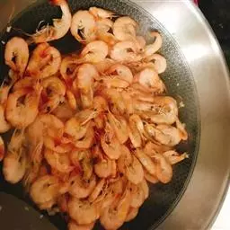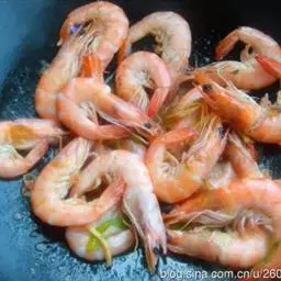 2)锅中倒入植物油,量略多,烧8成热,然后将虾倒进油锅煎至虾变色。