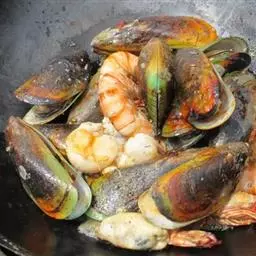 4)然后将虾倒进锅中,淋料酒,耗油,食盐适量,放入葱段,盖锅盖闷1—2分钟即可。