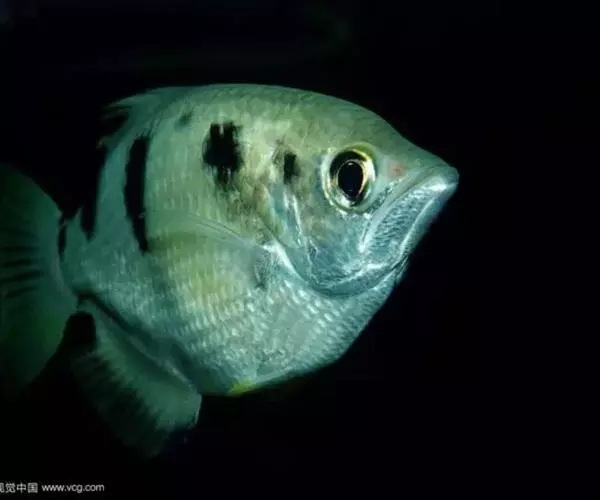 射水鱼体长约20厘米左右,体形接近卵形,头平吻尖,身体侧扁,眼大。体色银白鲜艳,有的呈淡黄色,略带绿色。长着一对水泡眼,眼白上有一条条不断转动的竖纹,在水面游动时,不仅能看到水面的东西,也能察觉空中的物体。