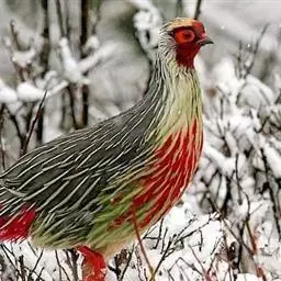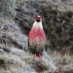 血雉雉科血雉属鸟类,别名血鸡、松花鸡,血雉的雄鸟大覆羽、尾下覆羽、尾上覆羽、脚、头侧、腊膜为红色,…
