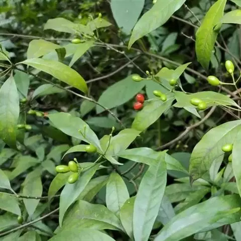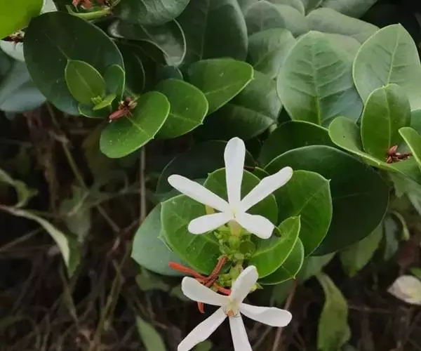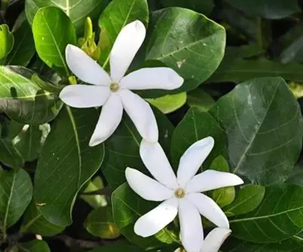 聚伞花序顶生,花冠高脚碟状,白色,芳香,长达2.7厘米;花萼短,5裂,裂片披针形,长约5.5毫米,宽2毫米,无毛,内面基部具腺体;花冠裂片长圆形,向左覆盖,长约为花冠筒的2倍,外面无毛,内面密被柔毛;雄蕊5枚,着生于花冠筒中部略上;子房全缘,2室,每室有胚珠10颗,花柱长圆柱状,柱头比雄蕊为高,顶端2裂,被毛。浆果卵圆形至椭圆形,长2-5厘米,亮红色;种子圆形,纸质,红色。花期8月。