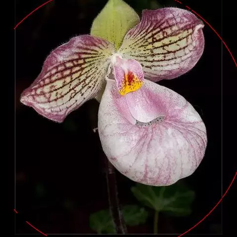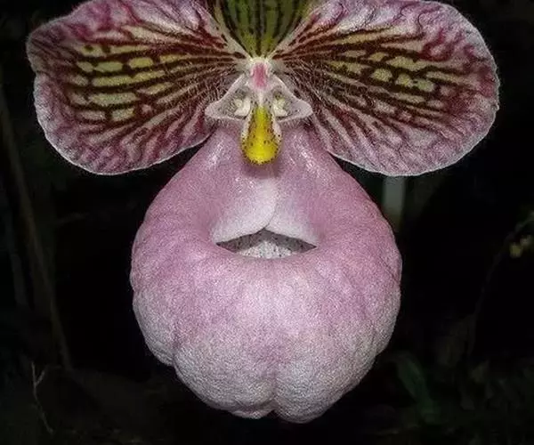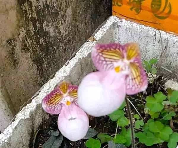 花葶直立,长10-26厘米,紫红色而有深色斑点,被长柔毛,顶端具1花;花苞片卵形或宽卵形,绿色而有紫色斑点,长1-1.4厘米,背面疏被长柔毛;花梗和子房长3.5-4.5厘米,被长柔毛;花大,艳丽,中萼片与花瓣通常白色而有黄色晕和淡紫红色粗脉纹,唇瓣白色至淡粉红色,退化雄蕊黄色并有淡紫红色斑点和短纹;中萼片卵形或宽卵形,长2-3厘米,宽1.8-2.5厘米,先端急尖,背面被长柔毛并有龙骨状突起;合萼片卵形或宽卵形,长2-2.8厘米,宽1.8-2.8厘米,先端钝或急尖,背面被长柔毛并具2条稍钝的龙骨状突起;花瓣宽卵形、宽椭圆形或近圆形,长2.8-3.2厘米,宽2.6-3.5厘米,先端钝或浑圆,内表面基部具白色长柔毛,背面多少被短柔毛;唇瓣深囊状,卵状椭圆形至近球形,长4.5-6.5厘米,宽4.5-5.5厘米,基部具短爪,囊口近圆形,整个边缘内折,囊底有白色长柔毛;退化雄蕊椭圆形,长1-1.5厘米,宽7-8毫米,先端急尖,两侧边缘尤其中部边缘近直立并多少内弯,使中央貌似具纵槽;2枚能育雄蕊由于退化雄蕊边缘的内卷而清晰可辨,甚为美观。花期3-5月。