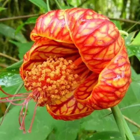 直立或攀援灌木,高1-2米;枝红褐色或棕褐色,无毛,疏生皮刺,小枝常有白粉。叶片盾状,卵状圆形,长7-17厘米,宽6-15厘米,基部心形,两面均有贴生柔毛,下面毛较密并沿中脉有小皮刺,边缘3-5掌状分裂,裂片三角状卵形,顶端急尖或短渐尖,有不整齐细锯齿;叶柄4-8厘米,无毛,有小皮刺;托叶大,膜质,卵状披针形,长1-1.5厘米,无毛。单花顶生,直径约5厘米或更大;花梗长2.5-4.5厘米,无毛;苞片与托叶相似;萼筒常无毛;萼片卵状披针形,两面均有柔毛,边缘常有齿;花瓣近圆形,直径1.8-2.5厘米,白色,长于萼片;雄蕊多数,花丝钻形或线形;雌蕊很多,可达100,被柔毛。果实圆柱形或圆筒形,长3-4.5厘米,桔红色,密被柔毛;核具皱纹。花期4-5月,果期6-7月。