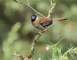 黑顶噪鹛:中型鸟类,体长24-26厘米。前额、脸、颏、喉黑色,头顶黑褐沾棕或深棕橄榄褐色,…