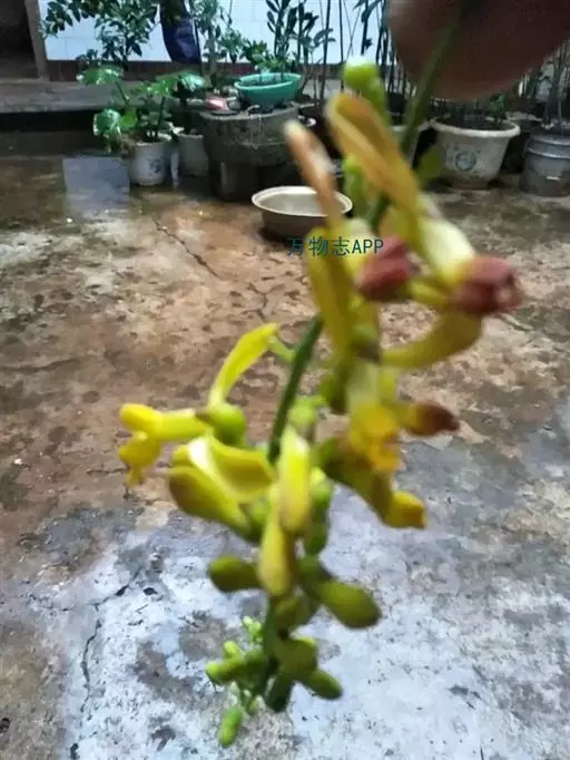总状花序与叶对生,下垂,密被短柔毛,长7-10厘米,果时长达25(-30)厘米;花长13-20毫米,花梗长约3毫米,玻短柔毛,基部具三角状渐尖的苞片1枚;萼片5,具缘毛,花后脱落,外面3枚小,不等大,上面1枚深兜状,长8-9毫米,侧生2枚卵形,长约5毫米,宽约3毫米,先端圆形,内萼片2枚,花瓣状,红紫色,长圆状倒卵形,长15-18毫米,与花瓣几成直角着生;花瓣3,肥厚,黄色,侧生花瓣长11-15毫米,较龙骨瓣短,2/3以下与龙骨瓣合生,基部外侧耳状,龙骨瓣盔状,具丰富条裂的鸡冠状附属物;雄蕊8,花丝长约14毫米,2/3以下连合成鞘,并与花瓣贴生,花药卵形,顶孔开裂;子房圆形,压扁,径约3毫米,具狭翅及缘毛,基部具肉质花盘,花柱长8-12毫米,向顶端弯曲,先端呈喇叭状2裂,柱头生于下裂片内。