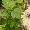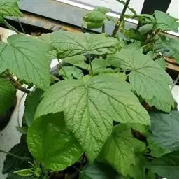 叶近圆形,长4-9厘米,宽4.5-11厘米,基部心脏形,上面暗绿色,幼时微具短柔毛,老时脱落,下面被短柔毛和黄色腺体,掌状3-5浅裂,裂片宽三角形,先端急尖,顶生裂片稍长于侧生裂片,边缘具不规则粗锐锯齿;叶柄长1-4厘米,具短柔毛,偶而疏生腺体,有时基部具少数羽状毛。