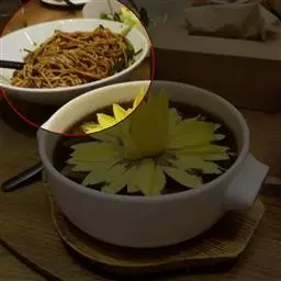 锅内沙茶酱调和高汤小火烧开,放入盐、鸡粉调味后下炸豆腐片、猪大肠,沙茶卤汤浇于碱水油面上即可。